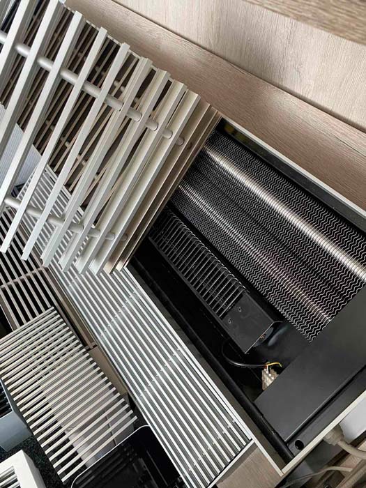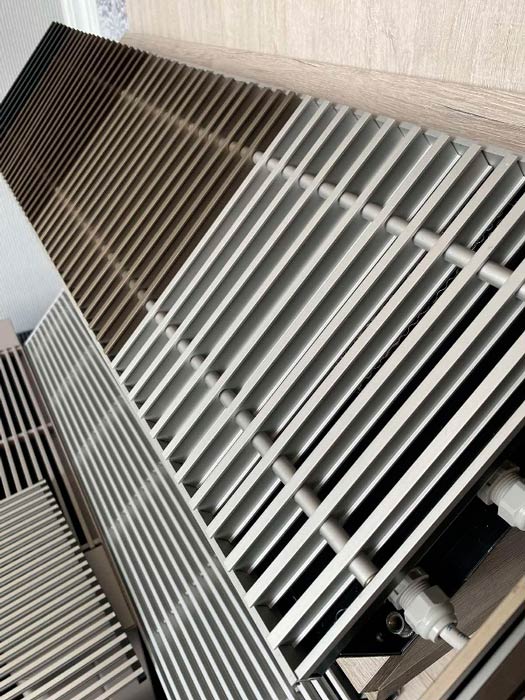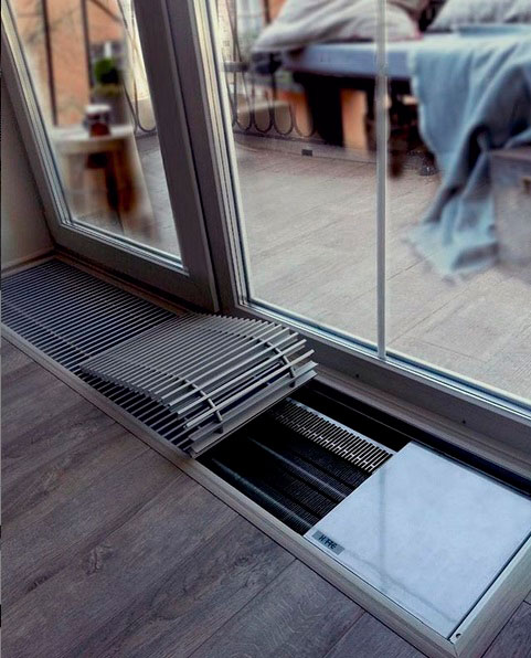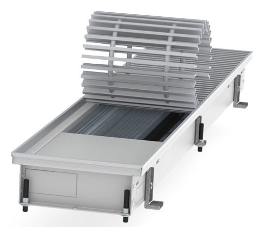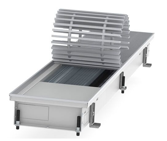Внутрішньопідлоговий конвектор Hitte FXX - опалювальний прилад, який монтується в підлогу, працює за принципом примусової конвекції (з вентилятором), що значно збільшує його теплову потужність і здатний самостійно справлятися з обігрівом навіть великих приміщень. Також цей тип приладів є відмінною тепловою завісою від холодного повітря, адже він розташовується вдовж майже всього скління і нагріває холодне повітря, яке опускається вниз.