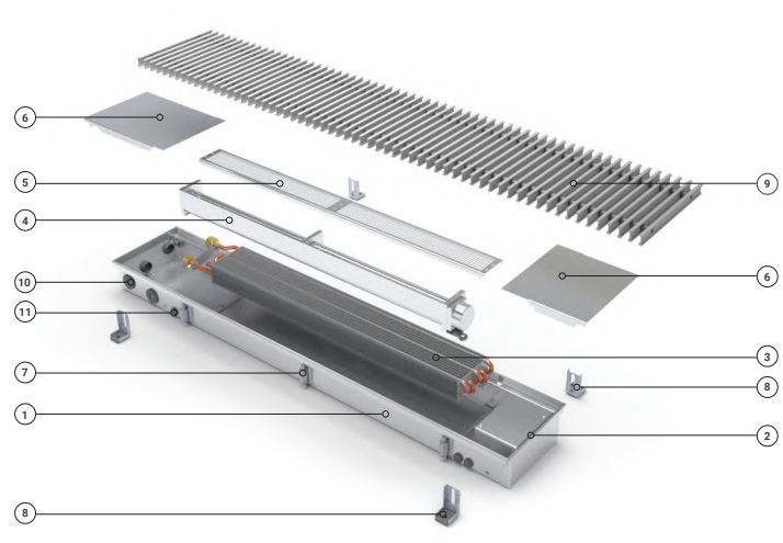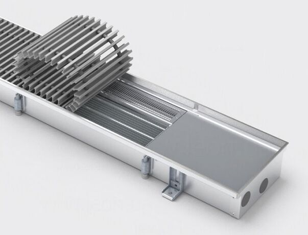 Особливістю внутрішньопідлогових конвекторів Конвека є 8-титрубний мідний теплообмінник із частонасадженими алюмінієвими пластинами, а також металеві заслінки з його боків, які перешкоджають змішуванню холодного та теплого повітря. Завдяки цьому та потужному вентилятору 24В тепловіддача приладу вигідно відрізняє його від конкурентів.