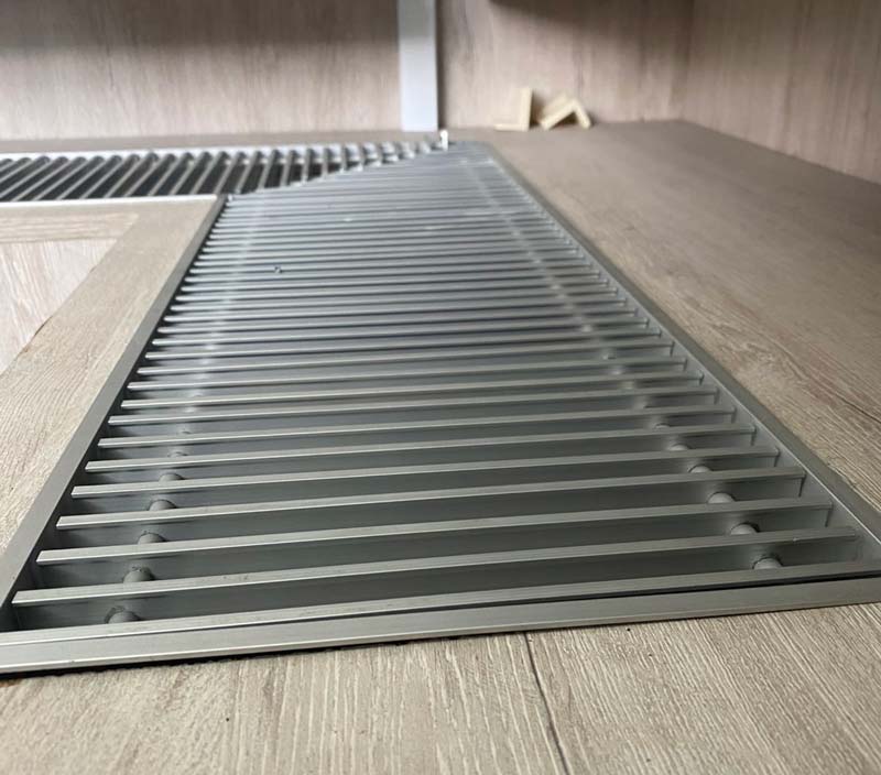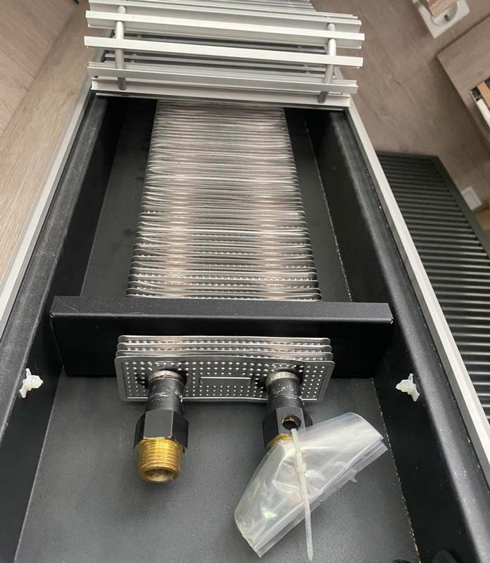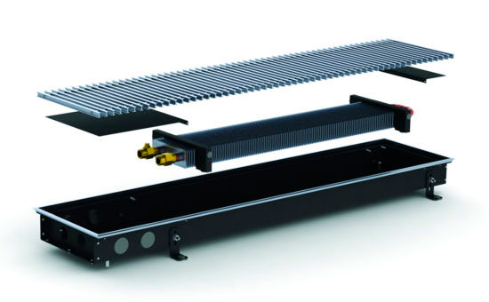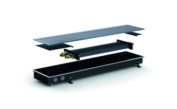 Основным элементом этого прибора является прямоугольная коробка, изготовленная с применением качественной прочной стали. Используя кассетное крепление, в него установлен медно-алюминиевый теплообменник. Сверху коробчатый корпус закрывается декоративным уголком и алюминиевой решеткой с поперечно расположенными ребрами.