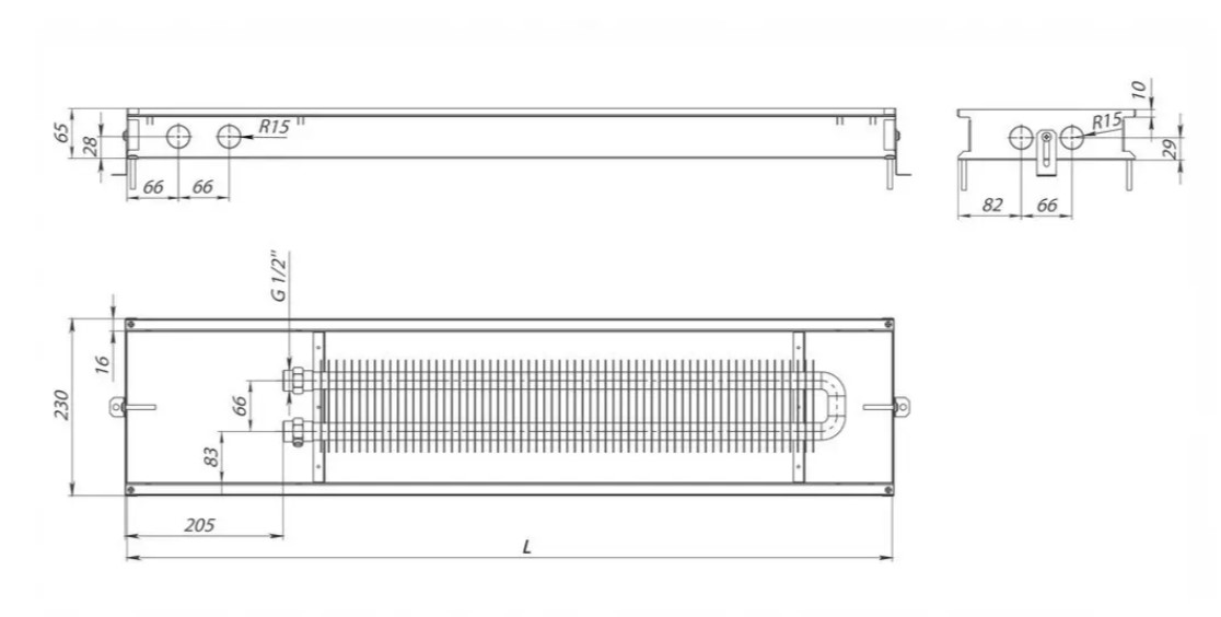 Отопительный прибор изготавливается со стандартной шириной в 230 мм и высотой 65 мм. При этом его длина может быть в диапазоне 1…3 м.
