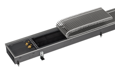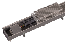 Принцип действия: Воздух из помещения забирается вентилятором и проходит через нагревательный элемент с воздухонаправляющими пластинами. Нагретый воздух выходит из встроенного в пол конвектора и поднимается вверх и обеспечивает оптимальную защиту от холодного воздуха из окна и направляет нагретый воздух в помещение равномерно, не образуя сквозняка. Разделительная пластина эффективно не допускает «короткого замыкания» между забором и выпуском.