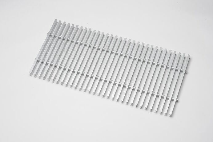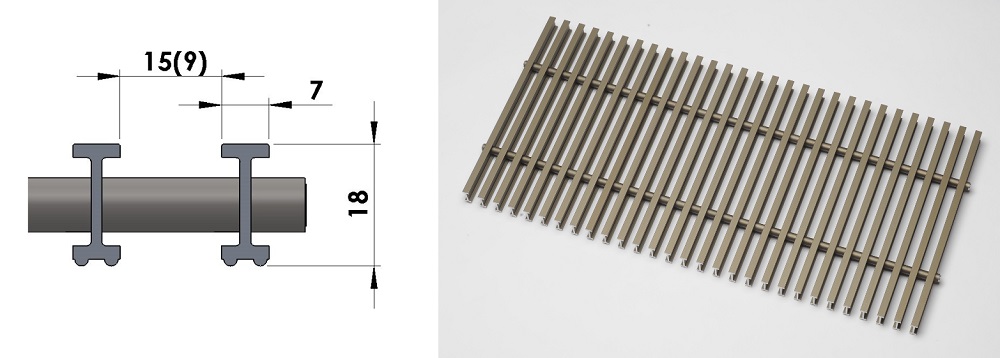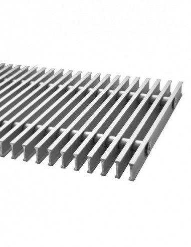 Решетка имеет привлекательный внешний вид и состоит из алюминиевых ламелей расположеных продольно, а не поперечно. Имеет высоту профиля - 18 мм, ширину - 7 мм и расстояние между планками - 12,5 мм. Заказ данного типа решетки согласовывается сразу при выборе конвектора, так как желоб в конвекторе, на который укладывается решетка корректируется по глубине и сдвигается внутрення часть корпуса.