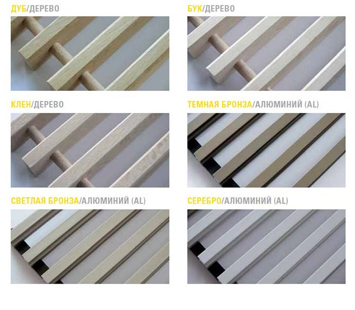Деревянная решетка может быть изготовлена из таких пород дерева как дуб, бук, клен. Высота решетки составляет 18 мм, ширина - 10 мм. Расстояние между планками в "густом" варианте - 9 мм, в "редком" - 15 мм