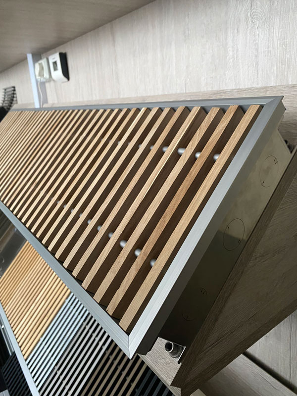 Декоративная решетка сделана из алюминия на пружине - сворачиваемая, размер 18х7 мм, расстояние между ламелями - 14,5 мм.